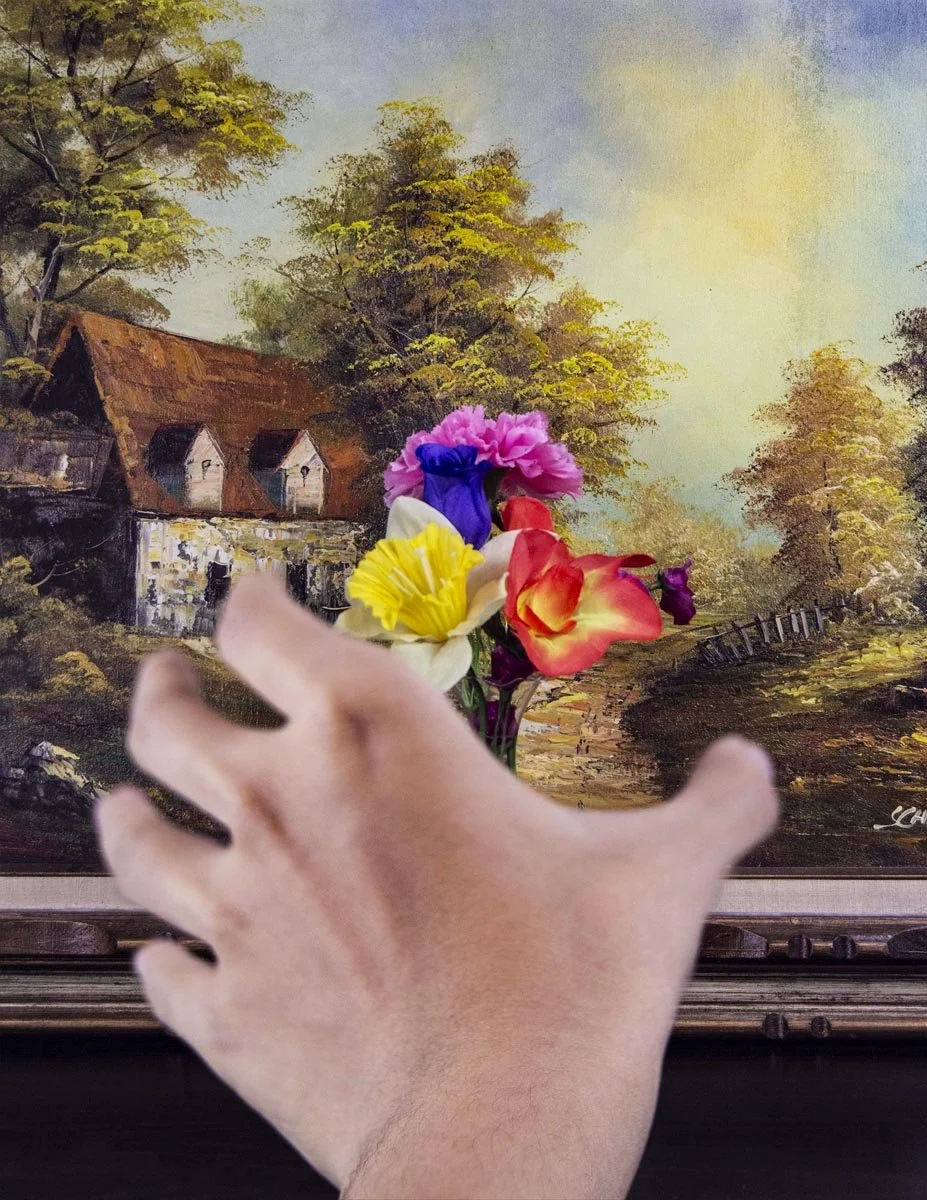 I have two diptychs and one triptych; the rest are singular pictures. One set of diptychs is of shadows, and the other is of a wine glass reflecting the background upside down. The shadow is of my sister; you can also see her dog peering out behind. The triptych is of a lake and a hand; the hand looks like it is trying to grab and hold onto the lake.